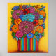 Vibrante pintura estilizada de un colorido ramo de flores en un jarrón colorido a rayas a juego de la popular artista Lisa Lorenz.