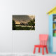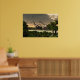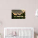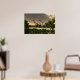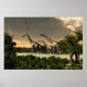 Tres dinosaurios de Brachiosaurio recorren una zona boscosa, mientras que tres terosaurios vuelan sobre sus cabezas.