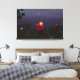 Al atardecer de una noche de verano, las luciérnagas flotan y brillan sobre un rosa jardín lleno de rosales rojas vibrantes.