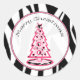Pegatina con fondo de cebra. El ilustracion dentro del círculo es de un árbol de Navidad con un esquema de color rosa. El árbol de Navidad presenta luces rosadas y adornos de huellas de cebra, estrellas y falda de árbol. El texto de arriba dice "Feliz Navidad".