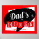 Este arte poster de estilo retro es perfecto para darle un toque de encanto a una cocina. Este diseño de estilo de los años 50 presenta la cita "Diner de papá...abierto las 24 horas" en una combinación de texto blanco y rojo, todo sobre un fondo geométrico rojo, negro y blanco.