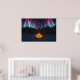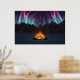En un valle cubierto de nieve, en una noche helada en los muertos de invierno, una hoguera salta hacia arriba para reflejar las luces del norte que llenan el cielo sobre las montañas lejanas.