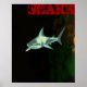 Guay imprimió ilustracion sobre tiburones para tus paredes. La imagen de un pez tiburón y un fondo negro grunge con la palabra "SHARK" en un tipo de letra rojo
