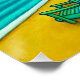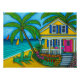 Una pintura de Lisa Lorenz de una vibrante y alegre escena tropical de una colorida y acogedora casa de playa a lo largo de una playa turquesa a orillas del mar.