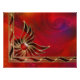 Una obra abstracta en rojo y dorado ardiente. Un claro diamante rojo está rodeado de llamas con bordes dorados acentuados con rubíes brillantes y explosiones de estrellas amarillas. Los fractales giratorios y en espiral en el fondo aparecen en colores más oscuros dentro de la filigrana dorada del motivo de la llama.