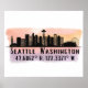 La impresión de arte muestra la silueta del perfil de la ciudad de Seattle Washington con salpicaduras de acuarela y coordenadas del mapa de latitud y longitud
