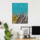Impresión ondulante de leopardo dorado, rayas de cebra negras, efectos brillantes de ducha azul pavo real. Impresión de imagen