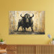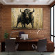 Una audaz huella de acuarela acrílica de un potente toro negro parado en su suelo, pintado en cálidos tonos dorados. Pieza de exposición perfecta para salones, oficinas o decoración de inspiración occidental.