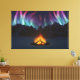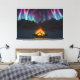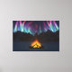 En un valle cubierto de nieve, en una noche helada en los muertos de invierno, una hoguera salta hacia arriba para reflejar las luces del norte que llenan el cielo sobre las montañas lejanas.