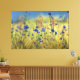 Colores y flores de maíz vivos azules florecen en un campo dorado de césped bajo un cielo azul pálido. El fondo rubio y verde también se ve interrumpido por el rosa brillante de las flores de hierba mojada.