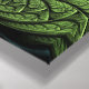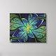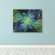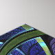 Faux hojas de vidrio teñidas de verde y turquesa enmarcan una flor central en tonos azules y violetas.