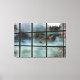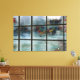 Un frío paisaje otoñal visto a través de una ventana de escarcha temprano una mañana. Pinos y pinos con hielo blanqueando sus agujas, armazones en tonos rojos, naranjas y amarillos, de hierba blanquecina helada vista a través de la niebla, saliendo de un arroyo oculto. Las hojas de rosa rojas y verdes que ondean la ventana a cada lado.