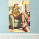 Un ilustracion vibrante inspirado en los años 50 de un hombre cómodamente instalado en un sillón de rayas verdes. Vestido con un chaleco verde, una camisa blanca y una corbata roja, exuda encanto y relajación, fumando una pipa con una sonrisa sutil. Sus medias rosas y sus zapatos marrones pulidos le dan un toque divertido a su conjunto clásico. La escena está bañada por una luz natural cálida, complementada con una lámpara de época y una taza de café sobre una mesa lateral, lo que crea una acogedora estética moderna de mediados de siglo