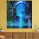 Una hermosa luz azul llena la noche en esta fantástica foto de un elegante arco de piedra, arbustos, puestos de plantas y un urno decorativo. Las estrellas brillan a través de la neblina. La sensación es mágica y de cuento de hadas.
