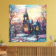 Una bonita pintura de tela con la imagen de una iglesia de invierno de vidrieras.