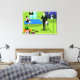 Esta impresión de tela estirada retro de Personalizado urbano incluye el dibujo personalizado de un apartamento de un ático con una decoración elegante, con vistas a un horizonte urbano. El apartamento cuenta con un suelo verde y una pared de ladrillo verde. En la pared hay cuatro pinturas de tela estiradas clásicas de la película Martini, también disponibles en la tienda Zazzle de StrangeLittleOnion (¡insinuación!). Tres de las impresiones tienen un fondo turquesa y una está sobre un fondo negro. Debajo de las estampas de lona, hay un sofá moderno azul de mediados de siglo. En el sofá hay una bonita y sofisticada belleza de pelo cuervo. Ella lleva un vestido clásico, pequeño, negro con un corpiño rosado caliente. En el lado opuesto de la habitación hay un hombre agradable, alto, oscuro y guapo. Lleva traje negro, camisa blanca y corbata verde. De un lado, él está sosteniendo un álbum de discos de vinilo y, de otro lado, está sosteniendo una portada de un álbum divertido. En el suelo, un otomano naranja sostiene un récord de jugador verde y negro. La portada de otro álbum, apuntada contra el otomano, tiene un disco que sale de un costado. También hay tres álbumes de vinilo coloridos diseminados por el suelo. Detrás del hombre, podemos ver a través de las puertas correderas de cristal un balcón verde. Un gato blanco vestido con un collar rosado está encaramado en el borde del balcón. Más allá del gato, hay un impresionante horizonte urbano con rascacielos y una luna creciente amarilla. Si así es como vive la otra mitad, ¡inscríbeme!