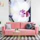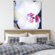 Esta foto digital en color en tela estirada presenta el cierre de una orquídea blanca con un centro púrpura y rojo.