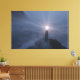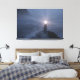 Un faro con una cruz mientras la luz brilla sobre las rocas y los rompientes de una orilla cubierta de niebla, mostrando a los barcos entrantes el camino a la seguridad.