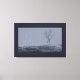 Un paisaje frío y ventoso en 3D en invierno, creado en Vue. Encima de una colina blanca con hielo y nieve, contra un cielo gris tormentoso con lluvia o manto cayendo sostenidamente, un solitario y desnudo árbol de arce se para con un banco de madera debajo.