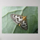 Este impresionante poster presenta una detallada fotografía de una bella polilla descansando bajo una planta de brócoli. La polilla se llama una pequeña polilla magpie por sus estampados en blanco y negro. También tiene una cabeza y cola amarillas impresionantes.