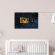 Mirando en las ventanas de la cabaña en una helada noche de invierno justo antes de los Navidades. Las velas rojas brillantes están encendidas, lo que envía un cálido resplandor sobre la nieve. El árbol de Navidad y el manto están decorados con púrpura y bolas de oro. Un gato calico mira por la ventana a una garganta sentada en el exterior del alféizar, y un par de zorros se asoma a la esquina de la casita.