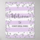 Impresión poster para señal de bienvenida con diseño falso de purpurina plateado y rayas moradas de fondo acuático.