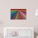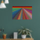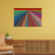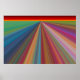 Este poster llamativo es una pintura digital de un paisaje abstracto que consiste en líneas anguladas casi como caminos que conducen a un horizonte rojo y dorado. Las líneas se estrechan y convergen en el horizonte lejano, dando la impresión de viajar. Están en todos los colores del arco iris, incluyendo rojo, naranja, verde, azul, violeta, rosa y dorado. El poster haría una declaración de color fuerte pero armoniosa en cualquier habitación.
