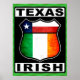 Impresión de Poster irlandés norteamericano de Texas. Diseño irlandés de Texas, al estilo de un genial cartel de ruta estadounidense. El texto Texas Irish está en la parte superior e inferior, con la bandera del Estado de Texas y la bandera de la República de Irlanda dentro del cartel de la ruta. Excelente para los texanos de ascendencia irlandesa, y para los expatriados en el estado de la estrella solitaria.