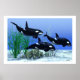 Dos hembras y un macho cazan ballenas juntas en el hermoso océano claro.