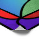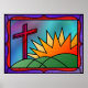 Un diseño de vidrieras que ilustra la mañana de Pascua, con una cruz roja parada en las verdes colinas junto a un ardiente amanecer.