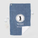 Silueta negra de hombre golfista en un marco blanco redondo con iniciales y nombre, en una toalla de golf de impresión de denim azul claro. Personalice las iniciales y el nombre para crear un regalo y un mantenimiento de golf únicos. Puede revertir las iniciales a un nombre más grande y quitar el nombre más pequeño. Utilice la plantilla simple proporcionada para cambiar el texto y hacerlo suyo. Dimensiones: 16" x 24", 80% poliéster trenzado/ 20% microfibra de mezcla de poliamida, grommet y gancho chapado en latón incluidos. Lavable a máquina.