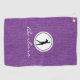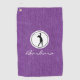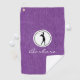 Silueta negra de una mujer golfista en un marco blanco redondo con nombre, en un denim morado imprimir toalla de golf. Personalice el nombre para crear un regalo y mantener un golf único. Cambie el texto para que sea suyo utilizando la plantilla simple proporcionada. Dimensiones: 16" x 24", 80% poliéster trenzado/ 20% microfibra de mezcla de poliamida, grommet y gancho chapado en latón incluidos. Lavable a máquina.