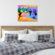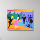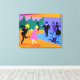 Esta impresión de tela estirada de Fiesta de techo urbano retro es intoxicante en su detalle. El diseño personalizado presenta el tipo de fiesta de cócteles extremadamente sofisticado que normalmente sólo se ve en películas de los años 60. Hay mucho para los asistentes a la fiesta. Desde la comodidad de un apartamento ático, los huéspedes disfrutan de las vistas y del ambiente. La iluminación crea un ambiente y podemos ver las siluetas oscuras de una pareja atractiva bailando la cha-cha. En el suelo hay un reproductor de discos morado, portátil, a los pies de la pareja de bailarines. Hay varios álbumes en las cercanías. Incluso con la iluminación tenue que hace que prácticamente todo aparezca en tonos violetas, azules y negros, se puede decir que todo el mundo está vestido a la perfección. Detrás de la pareja cubierta, bailando, hay un caballero vestido con un traje negro que sostiene una copa de martini. Está hablando con una belleza de cabello oscuro que está parado cerca de una de las paredes de vidrio del suelo al techo. Desde un portalámparas, una sola bombilla está proyectando un resplandor romántico sobre la escena. Lo único que falta es la lámpara. Hmm... ¿Dónde está la sombra? Está en la cabeza de un hombre mareado que ha llevado al fiesta fuera al tejado del naranja. Está claro que tiene algunos buenos movimientos de baile y no tiene miedo de mostrárselos al mundo. Su compañera es una mujer amorosa y rubia con un vestido rosa brillante. Su espalda es arqueada mientras arroja su martini de una manera desinhibida. Más allá del fiesta, hay un impresionante horizonte verde azulado, con rascacielos y un cielo morado. Si así es como vive la otra mitad, ¡inscríbeme!