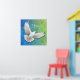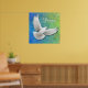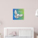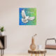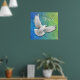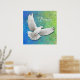 Diseño original de arte fino de una paloma de paz blanca voladora contra un fondo verde azul bonito por la artista Carolyn McFann de Two Purring Cats Studio impreso en una impresión poster de calidad.