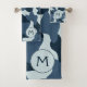 Toalla de baño de doble impresión en forma de monograma, elegante, de moda y audaz, en tonos azules. Dentro del círculo, hay un monograma con letras azules de marcador de posición, que es PERSONALIZABLE para que pueda añadir su inicial. Cuando es hora de modernizar la decoración de los cuartos de baño, no te equivoques con los audaces patrones de manchas de vaca... Podrá elegir entre una amplia selección de regalos a juego por Diseño Berenés.