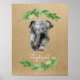 Impresión de elefante dulce, perfectamente neutral con fondo marrón kraft, vegetación acuarela y texto caligráfico blanco.