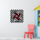 Un abstracto llamativo, un torbellino de blanco y negro con acentos rojos brillantes sobre un fondo a cuadros.