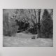 Esta hermosa fotografía del paisaje invernal es un asombroso poster de un banco cubierto de nieve sentado entre los árboles. Bonita impresión en blanco y negro para regalar o colgar en tu oficina.