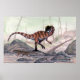Esta es una huella de una acuarela del paleoartista Christopher DiPiazza. El Dilofosauro se hizo famoso por el Parque Jurásico, pero el verdadero animal era muy diferente de la criatura retratada en la película. Dilofosauro tenía unos 20 metros de vida y tenía un hocico estrecho lleno de dientes largos y puntiagudos. No escupió veneno, ni tuvo un toque retráctil en la vida.
