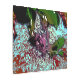 Rama de acebo con bayas moradas en relieve con efecto metálico sobre un fondo abstracto con motivos florales.