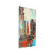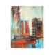 Abstract cityscape with tall, colorful skyscrapers evokes a sense of urban dynamism. The blend of blues, reds, and oranges creates a vibrant atmosphere.