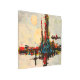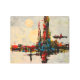 A vibrant cityscape is portrayed with bold, abstract strokes in red, blue, and yellow against a muted gray background. Two large, glowing moons add a surreal, otherworldly atmosphere to the scene.