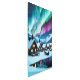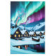 La imagen representa una pintoresca escena invernal con una hilera de acogedoras cabañas de madera enclavadas en un valle nevado. Los camarotes están provistos de ventanas cálidas y resplandecientes, y el humo que sale de sus chimeneas crea una sensación de confort y calidez. La escena está iluminada por los colores vivos de la aurora boreal, una impresionante exhibición de luces verdes y violetas que se proyectan a través del cielo nocturno.