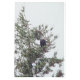 Fotografía de un águila calva norteamericana en un árbol de coníferas que tiene muchos conos de pino colgando de sus ramas. El águila madura está encaramado en una delgada extremidad que recorre el paisaje. El cielo está cubierto por una nube gris clara, lo que indica una temperatura fría. Derechos reservados ©2021 Kimberly J Tilley.