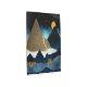 Un paisaje abstracto con colores y texturas únicos que muestran una escena montañosa nocturna con brillantes luces de escaladores y una luna en tonos azules, dorados, cian y amarillos.