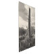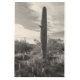 Una fotografía monocromática muestra un cactus alto de saguaro en un paisaje desértico. El cactus es el foco central, con su textura de lazo y brazos redondeados. El fondo está cubierto de un cielo turbio y de otra vegetación desértica, como pequeños cactus y arbustos. La imagen tiene un toque vintage debido a los tonos monocromos y la composición hace hincapié en la cruda belleza del entorno desértico.