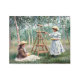 "In the Woods at Giverny, Blanche Hoschedé at Her Easel with Suzanne Hoschedé Reading" ofrece un tranquilo vistazo a la vida cotidiana en la casa de Mmonet en Giverny. Este trabajo captura un momento sereno en el que Blanche Hoschedé, hijastra de Monet, aparece pintando al aire libre, mientras que su hermana Suzanne Hoschedé lee cerca. La escena se despliega en medio de un frondoso entorno de bosques envueltos en el sol, donde la luz se filtra a través del follaje, proyectando suaves sombras. El lavado, caracterizado por trazos flojos y fluidos, capta los efectos fugaces de la luz y la atmósfera, creando una sensación de intimidad y armonía natural. La pintura no sólo celebra las actividades lúdicas de sus súbditos, sino que también muestra una fascinación por capturar el juego de la luz y los vivos colores de la naturaleza.