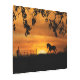 Una imagen caprichosa de un caballo trotando en la gran puesta de sol con una valla campestre enmarcada por un roble y sus ramas. Un hermoso y lindo hilo de arte en la pared.