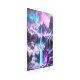 Imagen mágica de una cascada congelada que corre por una montaña cubierta de nieve con toques de colores neones.