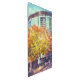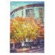 La imagen muestra un edificio moderno y curvo con ventanas de cristal, parcialmente oscurecido por árboles en follaje de otoño. Los árboles muestran una gama de colores desde el amarillo hasta el naranja y el rojo. La arquitectura del edificio es contemporánea, con una parte superior redondeada y una fachada de cristal reflexivo.